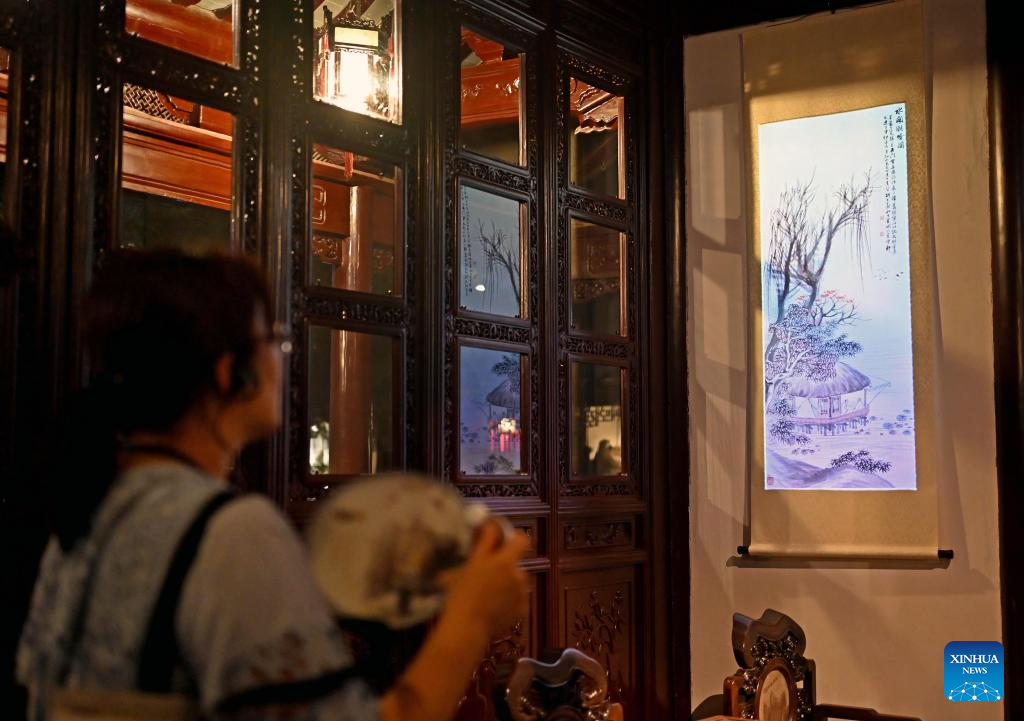 A woman views an ancient painting presented via digital technology in Yuyuan Garden, Shanghai, east China, on Aug. 8, 2025. Yuyuan Garden, a historic and cultural landmark in Shanghai, began offering night tours on Friday. (Xinhua/Liu Ying)