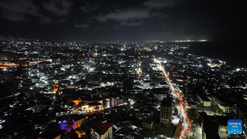 (250813) -- CONAKRY, Aug. 13, 2025 (Xinhua) -- Aerial photo taken on April 26, 2025 shows a night view of Conakry, Guinea. (Xinhua/Han Xu)