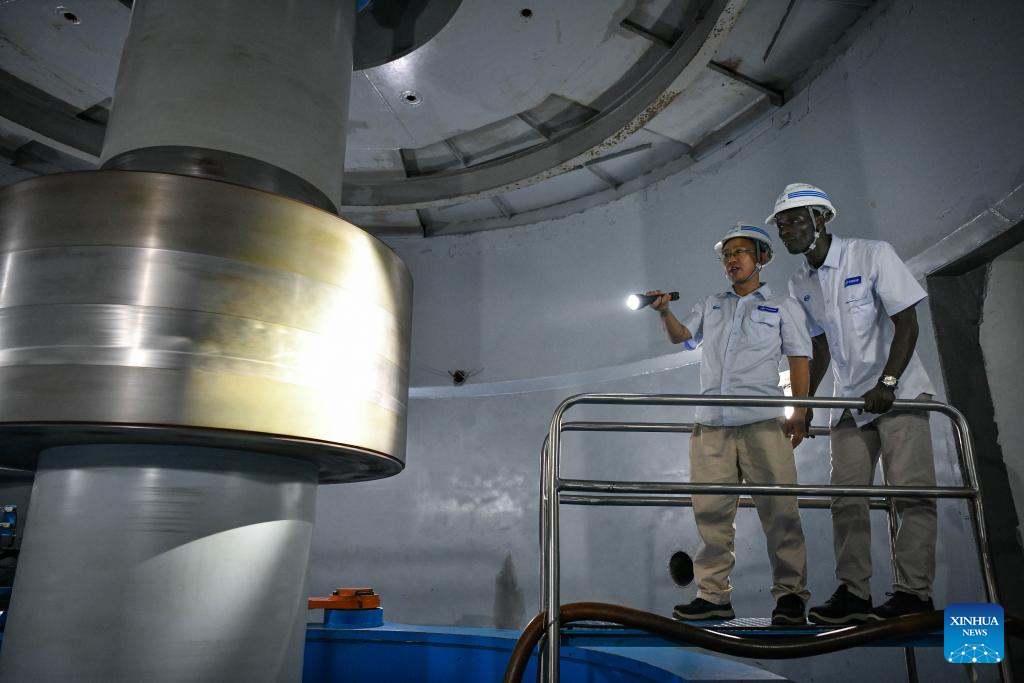 Chinese and Guinean technicians inspect equipment at the Kaleta Hydropower Station in Dubreka, Guinea, on April 24, 2025. (Xinhua/Han Xu)