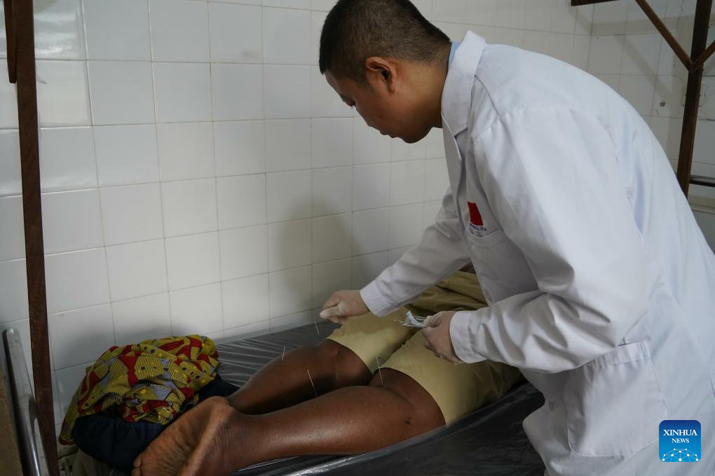 A doctor of the Chinese medical team in Togo performs acupuncture treatment on a patient at the Pya Medical and Social Center in Pya, Kozah Prefecture, Togo, Aug. 14, 2025. Chinese doctors on Thursday provided free clinical services to local people in the Pya area of northern Togo's Kozah Prefecture.
