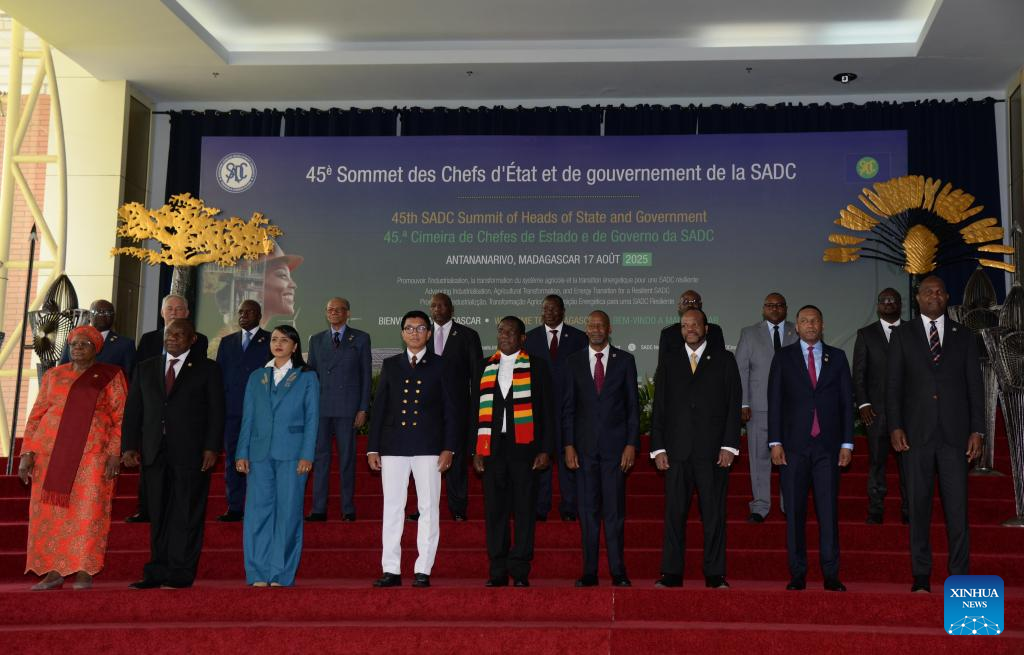 Participants pose for a group photo during the 45th Ordinary Summit of the Southern African Development Community (SADC) Heads of State and Government in Antananarivo, capital of Madagascar, Aug. 17, 2025. The 45th Ordinary Summit of the SADC Heads of State and Government opened in Antananarivo, capital of Madagascar, on Sunday, with regional leaders urging stronger industrial capacity and modernized agriculture to drive integration. (Photo by Sitraka Rajaonarison/Xinhua)