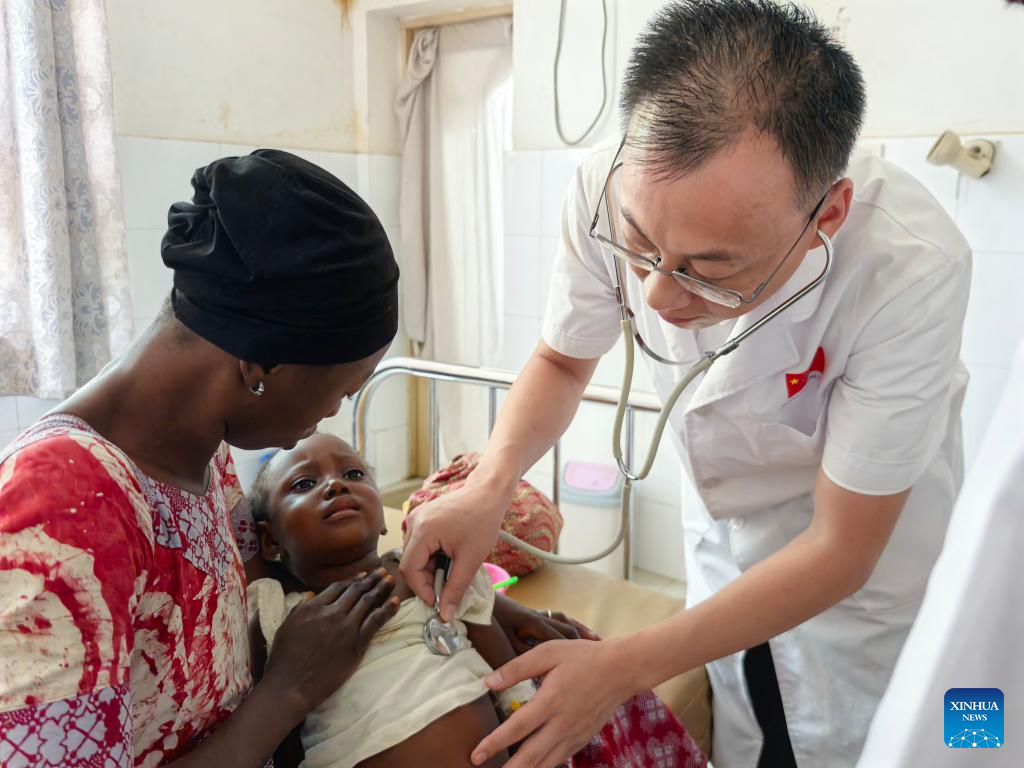 A member of the 26th batch of the Chinese medical team in Sierra Leone provides medical consultations for a child with tetanus in Freetown, Sierra Leone, on Aug. 21, 2025. (The 26th batch of the Chinese medical team to Sierra Leone/Handout via Xinhua)