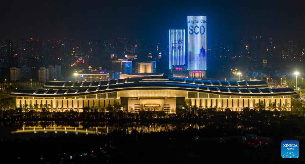 An aerial drone photo taken on Aug. 26, 2025 shows a night view of the main venue of the Shanghai Cooperation Organization (SCO) Summit 2025 in north China's Tianjin. The upcoming Shanghai Cooperation Organization (SCO) Tianjin Summit is scheduled for Aug. 31 and Sept. 1 in north China's port city of Tianjin. (Xinhua/Zhao Zishuo)