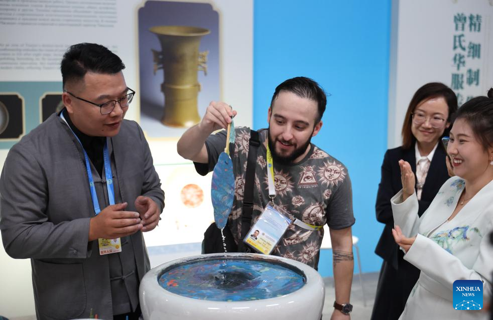 A foreign reporter learns to make traditional Chinese lacquer fan at the media center for the Shanghai Cooperation Organization (SCO) Summit 2025 in north China's Tianjin on Aug. 29, 2025. The upcoming Shanghai Cooperation Organization (SCO) Tianjin Summit is scheduled for Aug. 31 and Sept. 1 in north China's port city of Tianjin. (Xinhua/Yang Qing)