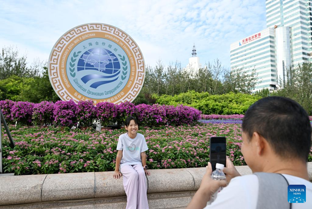 This photo taken on Aug. 28, 2025 shows decorations for the Shanghai Cooperation Organization (SCO) Summit 2025 in north China's Tianjin on Aug. 28, 2025. The upcoming Shanghai Cooperation Organization (SCO) Tianjin Summit is scheduled for Aug. 31 and Sept. 1 in north China's port city of Tianjin. (Xinhua/Zhao Zishuo)