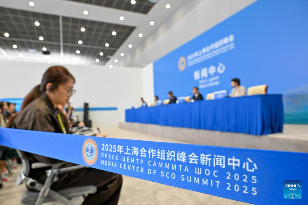 The first press conference is held at the media center for the Shanghai Cooperation Organization (SCO) Summit 2025 in north China's Tianjin on Aug. 28, 2025. The upcoming Shanghai Cooperation Organization (SCO) Tianjin Summit is scheduled for Aug. 31 and Sept. 1 in north China's port city of Tianjin. (Xinhua/Sun Fanyue)