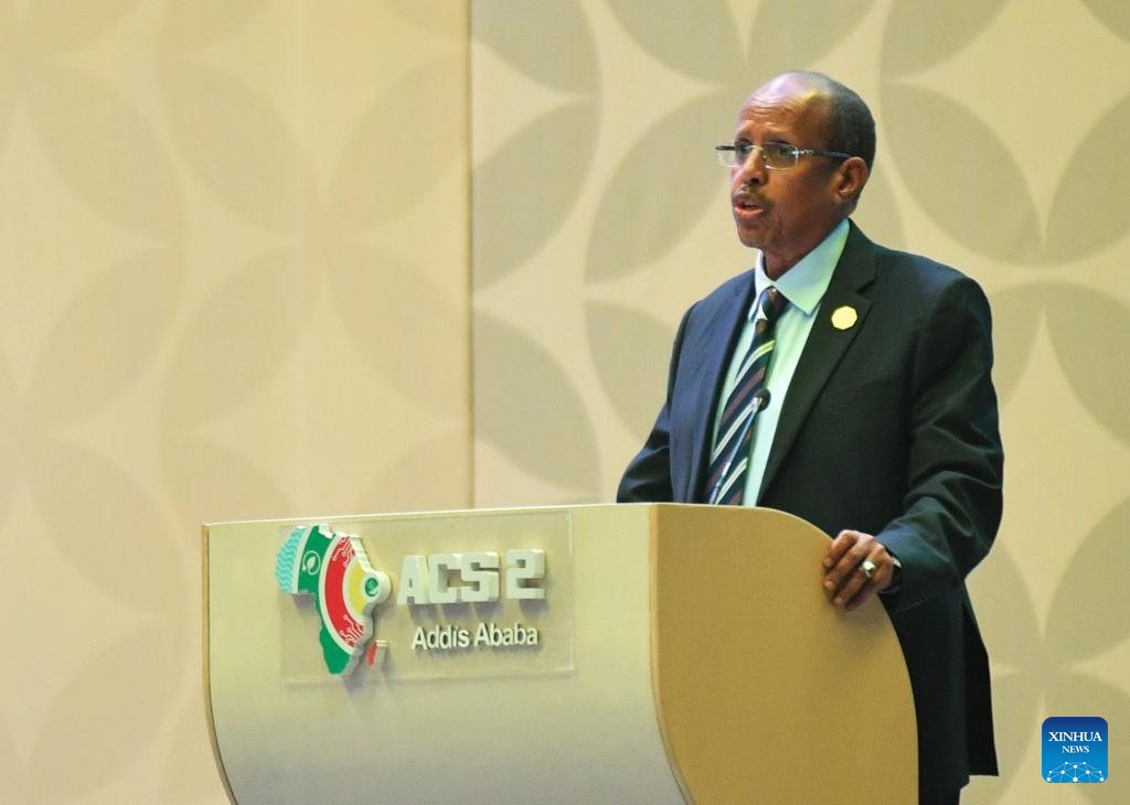 African Union (AU) Commission Chairperson Mahmoud Ali Youssouf addresses the Second Africa Climate Summit in Addis Ababa, Ethiopia, on Sept. 8, 2025. African leaders at the Second Africa Climate Summit on Monday called for stronger climate action and partnerships to advance the continent's green development goals. (Photo by Michael Tewelde/Xinhua)