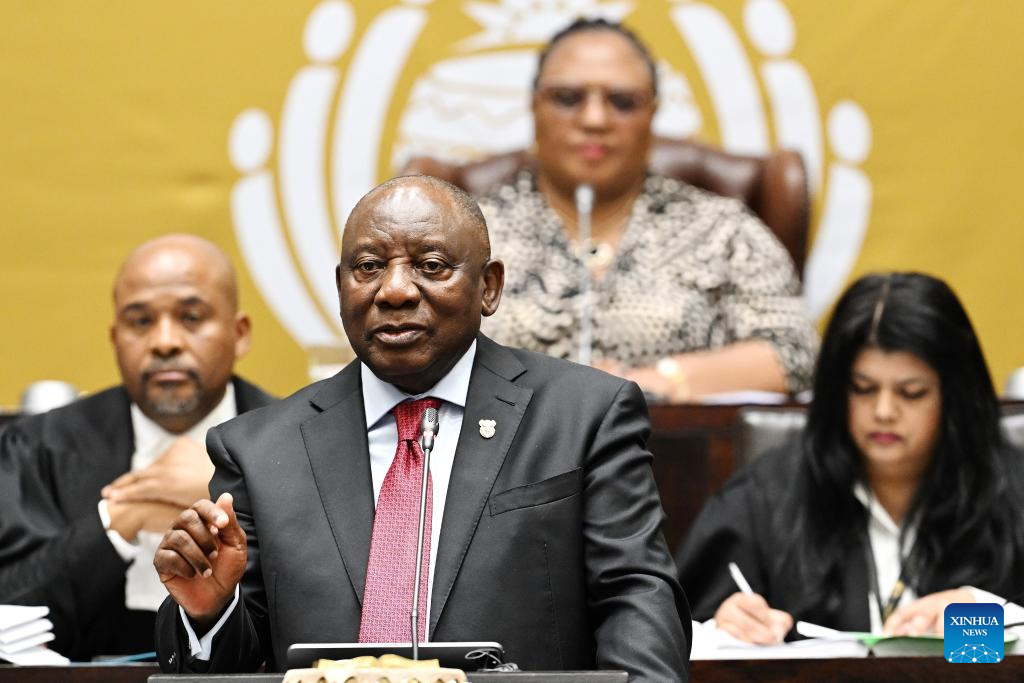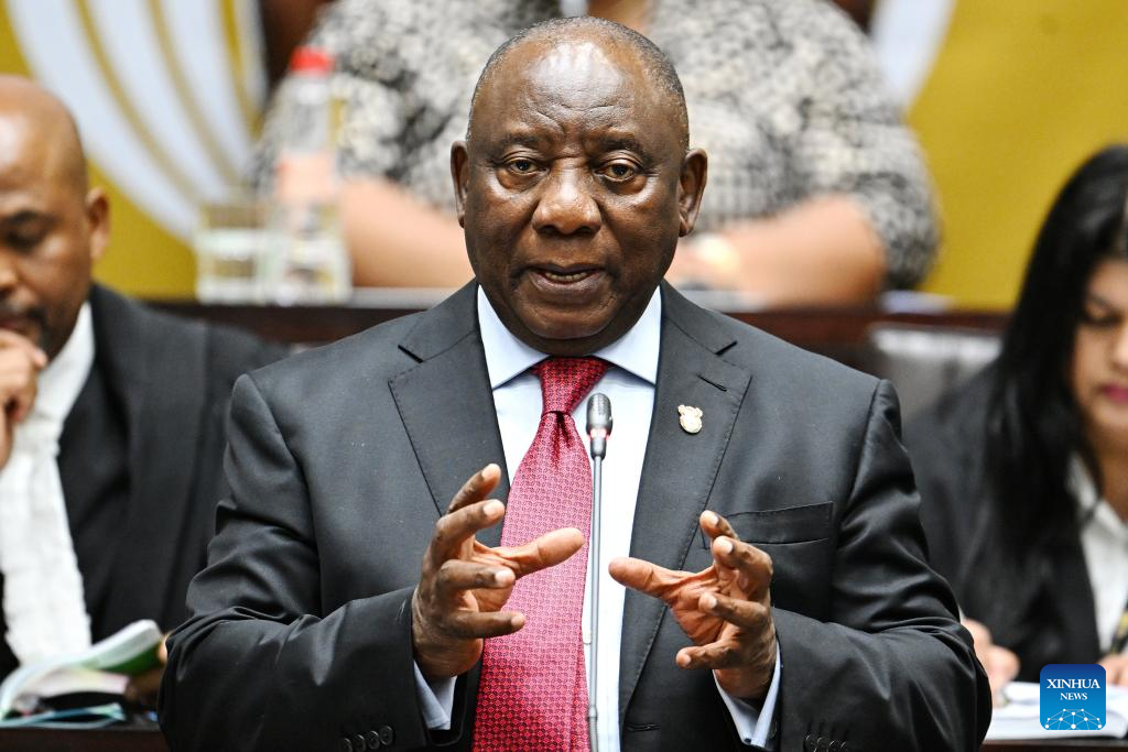 South African President Cyril Ramaphosa responds to questions in the National Assembly in Cape Town, South Africa, Sept. 9, 2025. Ramaphosa said on Tuesday that his government is actively engaging the United States to secure a fair trade and investment deal, but emphasized that the country will not "go on bended knee" in the negotiations. Responding to questions in the National Assembly on Tuesday afternoon, Ramaphosa told lawmakers that South African government representatives are currently in the United States for further formal negotiations. (Photo by Xabiso Mkhabela/Xinhua)