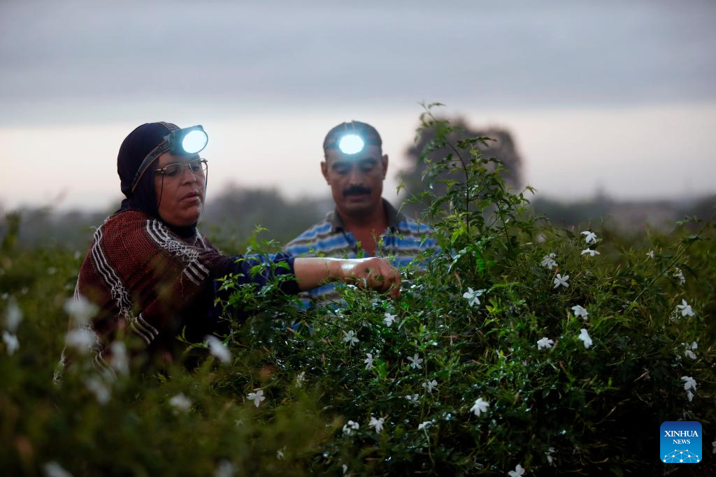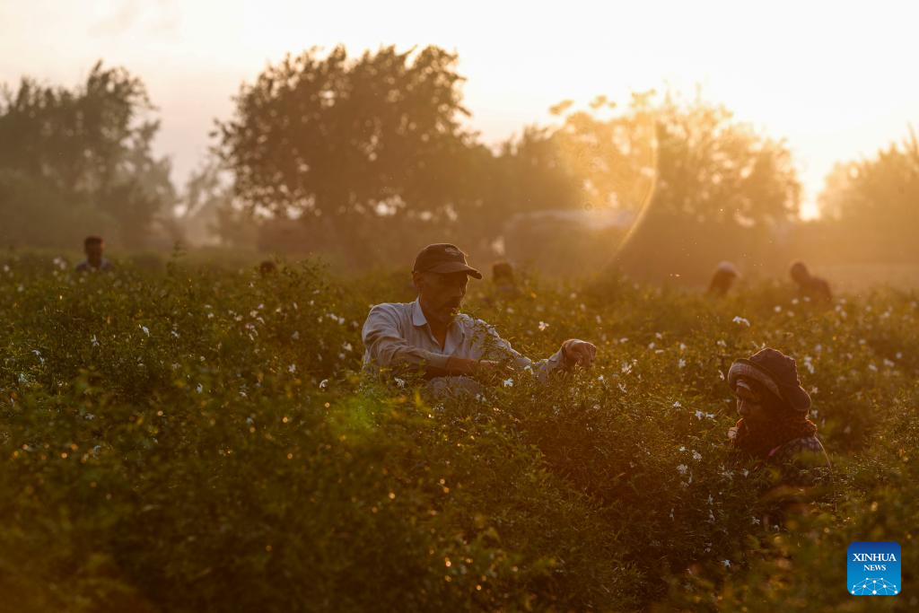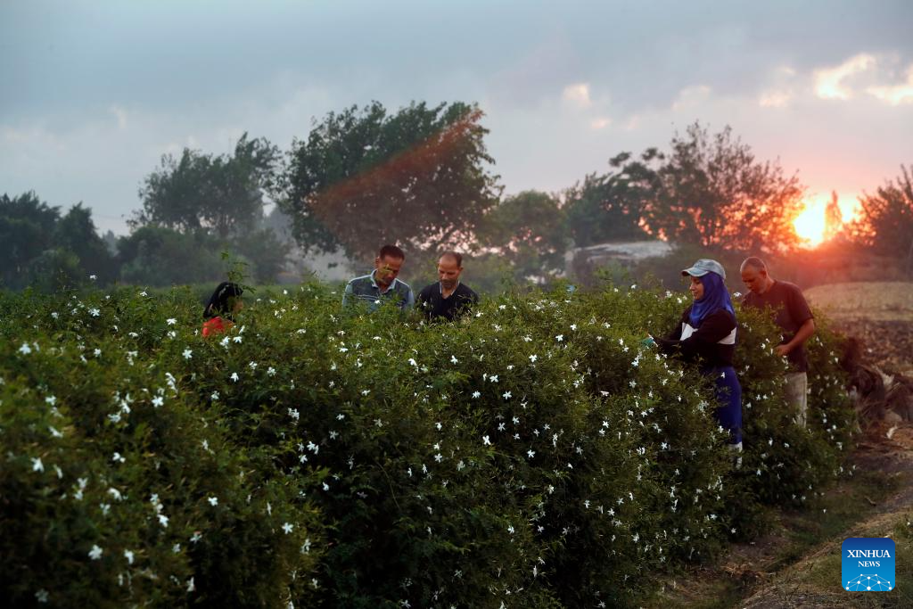 Farmers harvest jasmine flowers at a field in the village of Nagrig, Gharbia Governorate, Egypt, on Sept. 11, 2025. For generations, local farmers have cultivated and planted this delicate flower, which is exported abroad and an important source of income for many families. (Xinhua/Ahmed Gomaa)