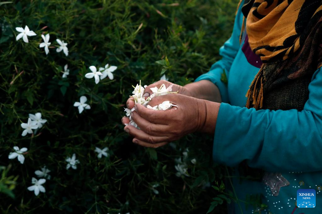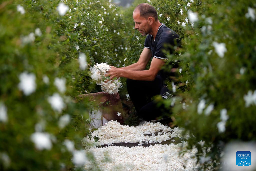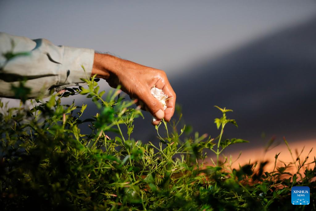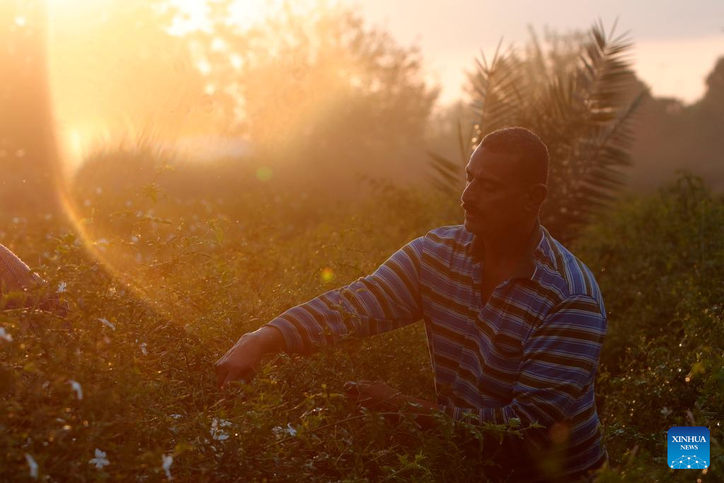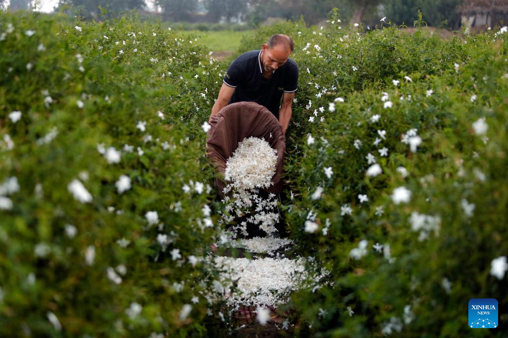 A farmer collects freshly-harvested jasmine flowers at a field in the village of Nagrig, Gharbia Governorate, Egypt, on Sept. 11, 2025. For generations, local farmers have cultivated and planted this delicate flower, which is exported abroad and an important source of income for many families. (Xinhua/Ahmed Gomaa)