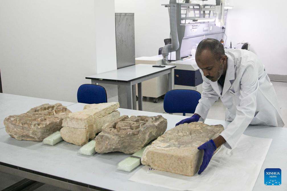 A conservator works on antiquities at a conservation lab of the National Museum of Egyptian Civilization (NMEC) in Cairo, Egypt, on Sept. 2, 2025. While visitors wander the sunlit halls above, marveling at treasures carved millennia ago, a quieter, more meticulous drama unfolds beneath their feet, in the shadowed depths of the NMEC. (Xinhua/Ahmed Gomaa)