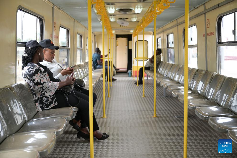 People take a meter-gauge commuter train in Mombasa, Kenya, on Sept. 17, 2025. Kenyan President William Ruto on Wednesday commissioned the Mombasa commuter railway service that will link downtown sections of the port city to a Standard Gauge Railway (SGR) terminus, which will ease the mobility of passengers and goods.(Xinhua/Yang Guang)