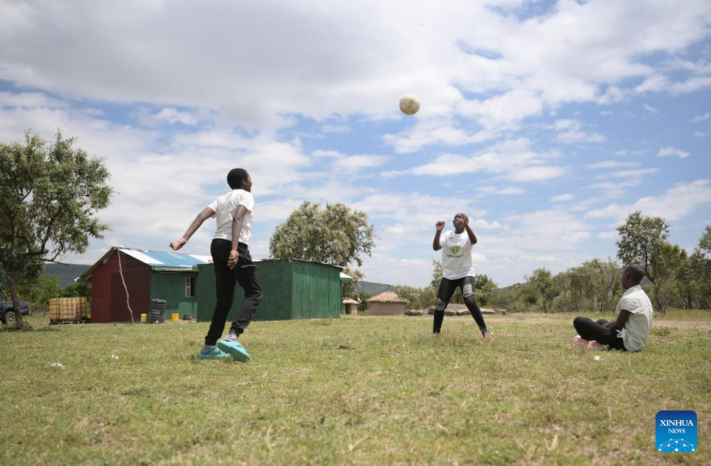 Girls play soccer at the Namunyak rescue center in Narok's Aitong Town, Kenya, Aug. 31, 2025. (Xinhua/Yang Guang)