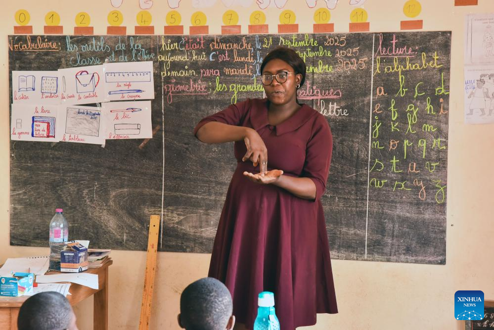 A teacher gives a lesson on sign language at a special school for hearing-impaired children in Yaounde, Cameroon, Sept. 22, 2025.