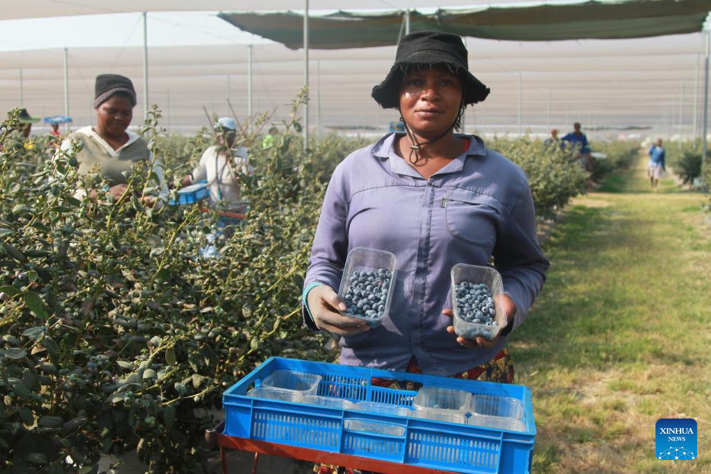 HARARE, Sept. 24 (Xinhua) -- Inside a greenhouse located in Zimbabwe's Mashonaland West Province, workers carefully hand-pick fresh blueberries from lush green shrubs, ensuring only the best fruit makes it to the baskets.
