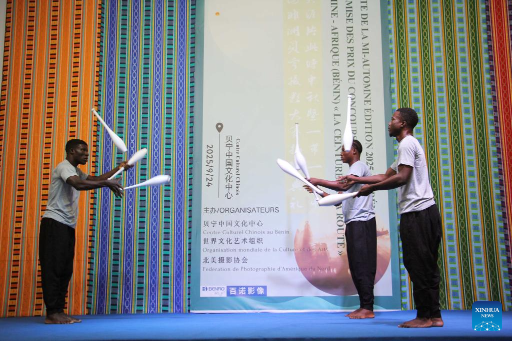 Local artists perform acrobatic stunts during the Mid-Autumn Festival celebration at the Chinese Cultural Center of Benin in Cotonou, Benin, Sept. 24, 2025. A Mid-Autumn Festival celebration was held at the Chinese Cultural Center of Benin on Wednesday. The event, featuring a photo exhibition, mooncake tasting, dance and acrobatic performances, attracted 180 guests from various circles. (Photo by Seraphin Zounyekpe/Xinhua)