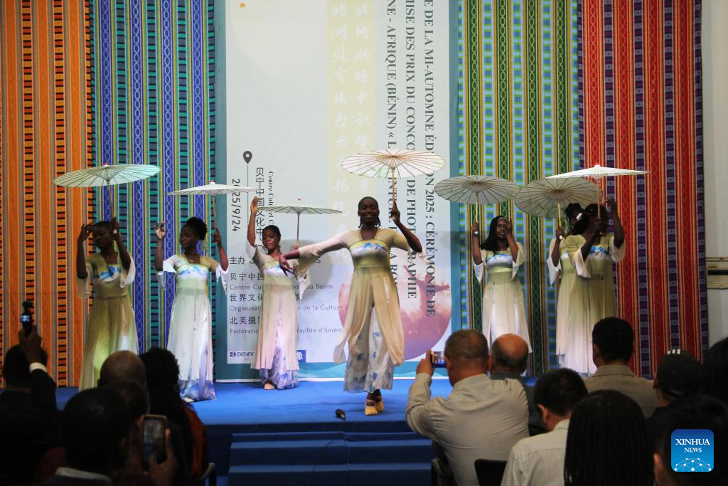 Students from the Confucius Institute perform a traditional Chinese dance during the Mid-Autumn Festival celebration at the Chinese Cultural Center of Benin in Cotonou, Benin, Sept. 24, 2025. A Mid-Autumn Festival celebration was held at the Chinese Cultural Center of Benin on Wednesday. The event, featuring a photo exhibition, mooncake tasting, dance and acrobatic performances, attracted 180 guests from various circles. (Photo by Seraphin Zounyekpe/Xinhua)