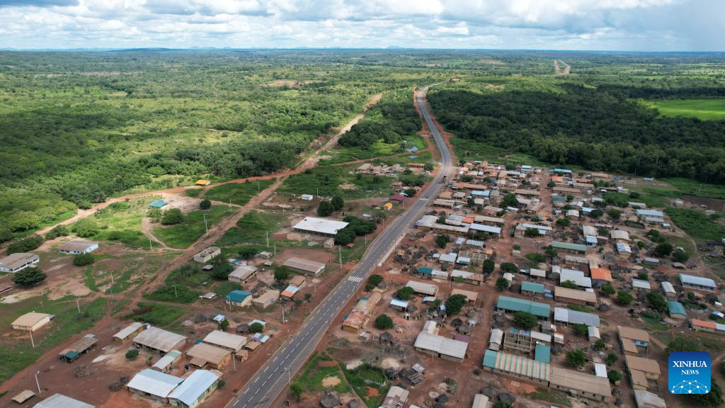 An aerial drone photo taken on Sept. 1, 2025 shows a section of the road from Odienne to Mali and Guinea in Kabadougou region, Denguele district of Cote d'Ivoire. In northern Cote d'Ivoire, a new two-lane highway hums with trucks while women balance baskets of mangoes and bananas, calling out to passing drivers along the roadside. Built by China Harbour Engineering Company Ltd. (CHEC), the 228-km road links Cote d'Ivoire with Mali and Guinea, cutting through the Kabadougou and Folon regions of Denguele District in a Y-shaped route reaching both neighbors. Since opening to traffic in March, it has resolved the long-standing problem of seasonal road blockages during the rainy season. (Xinhua/Si Yuan)