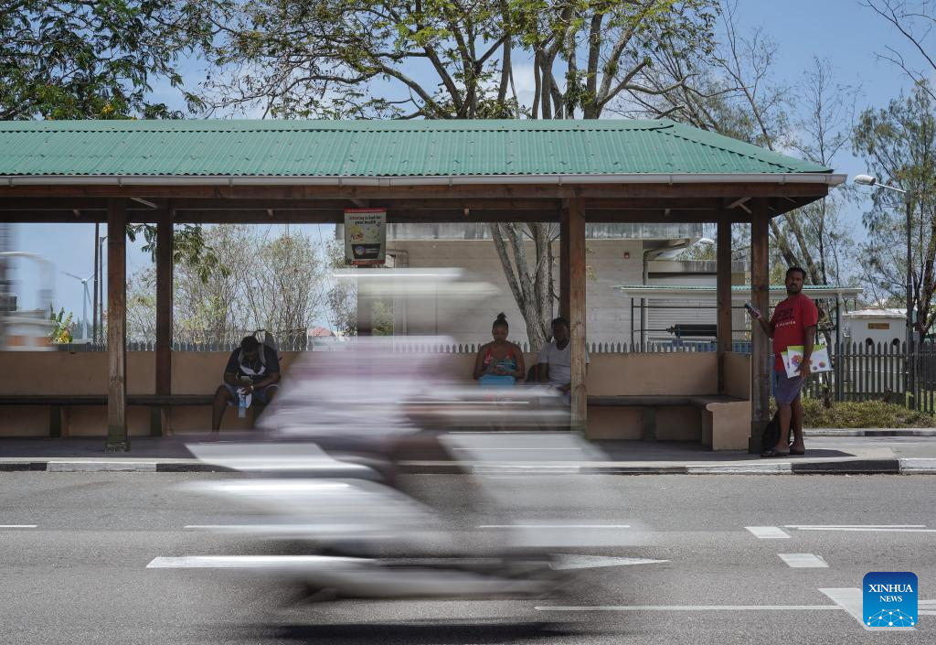 People wait for buses at a bus stop in Victoria, the capital of Seychelles, Sept. 29, 2025. (Xinhua/Han Xu)