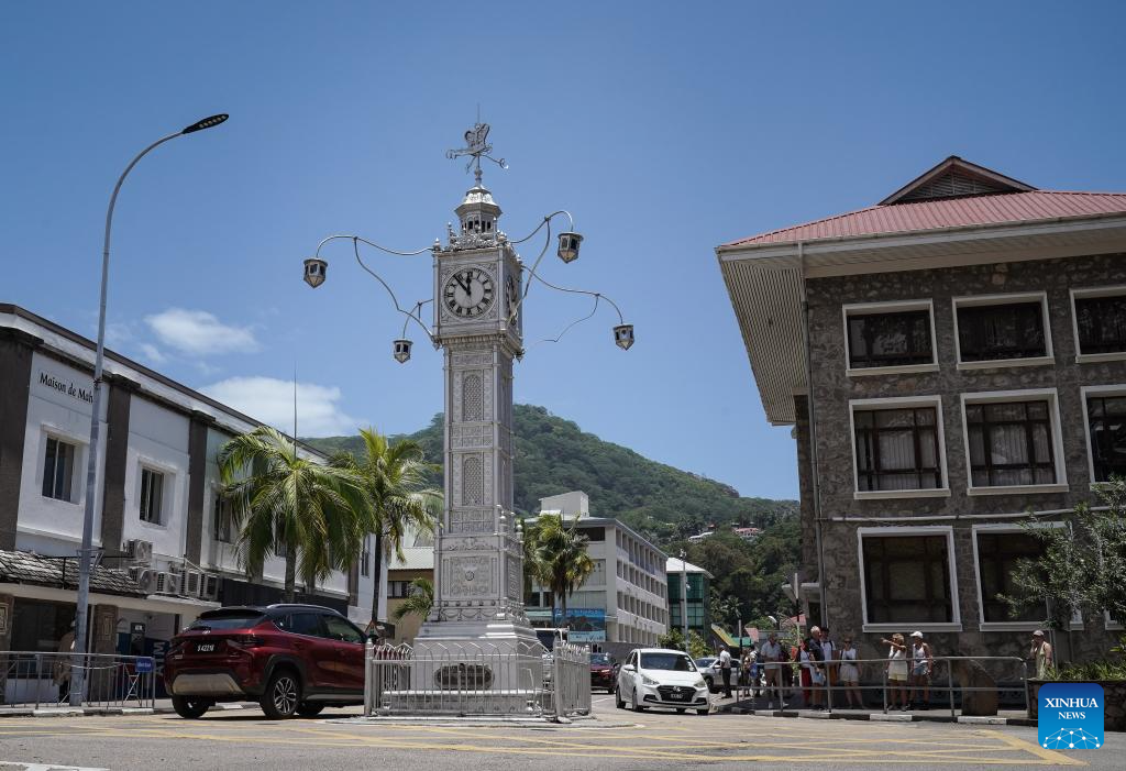 This photo taken on Sept. 29, 2025 shows the Victoria Clock Tower in Victoria, the capital of Seychelles. (Xinhua/Han Xu)