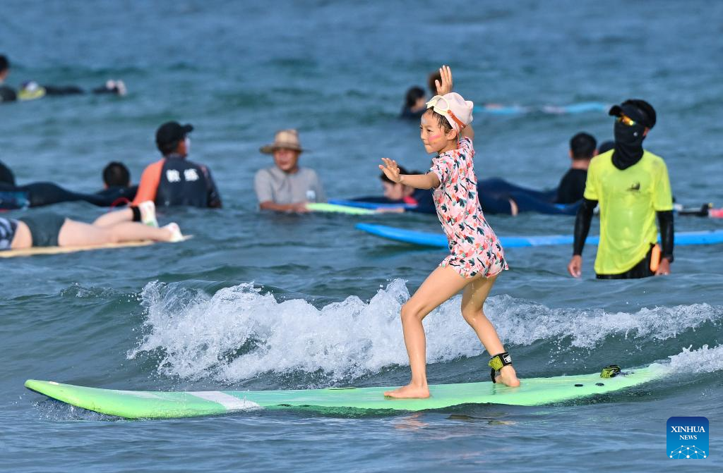 Tourists surf at Riyue Bay in Wanning, south China's Hainan Province, Oct. 2, 2025. Surfing has become a symbol of Wanning thanks to its unique geographical and climatic advantages. (Xinhua/Guo Cheng)