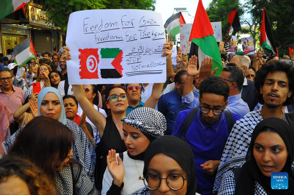 People gather to protest against Israel's interception of the Global Sumud Flotilla, at the center of Tunis, Tunisia, Oct. 4, 2025. Global Sumud Flotilla is an aid mission attempting to deliver humanitarian aid to Gaza. (Photo by Adel Ezzine/Xinhua)
