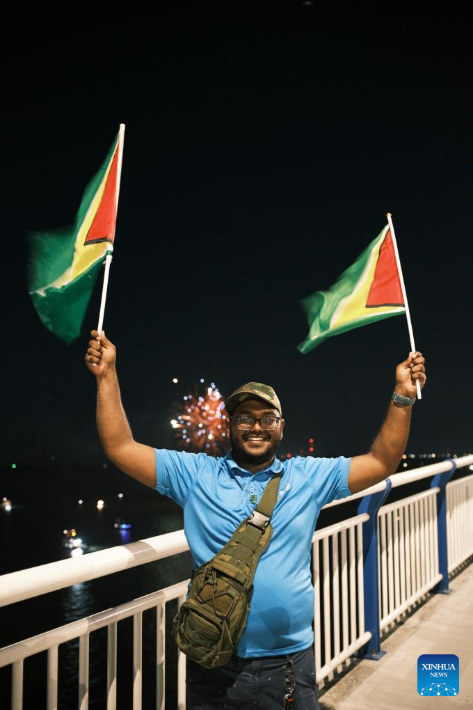 A man holding national flags of Guyana poses for a photo with fireworks on the new Demerara River Bridge in Georgetown, capital of Guyana, Oct. 5, 2025. The Chinese-built new Demerara River Bridge officially opened to traffic in Guyana on Sunday. (Xinhua/Xu Yongzheng)