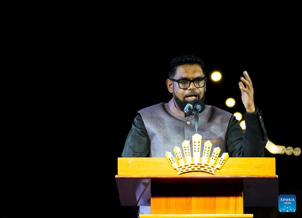 Guyanese President Irfaan Ali addresses the inauguration ceremony of the new Demerara River Bridge in Georgetown, capital of Guyana, Oct. 5, 2025. The Chinese-built new Demerara River Bridge officially opened to traffic in Guyana on Sunday. (Xinhua/Xu Yongzheng)