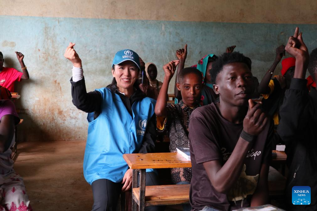Yang Yang (L), a goodwill ambassador for the U.N. High Commissioner for Refugees, interacts with students at a school in the Sherkole Refugee Camp on Sept. 24, 2025. (Xinhua/Liu Fangqiang)