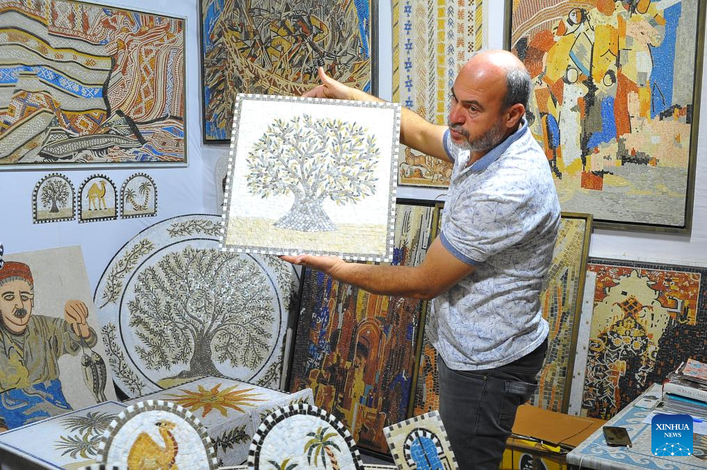 A merchant shows a mosaic painting to customers at a handicrafts fair in Tunis, Tunisia, Oct. 8, 2025. The second Tunisian Handicrafts Fair is held here from Oct. 6 to 12, with over 150 handicraft vendors participating. (Photo by Adel Ezzine/Xinhua)