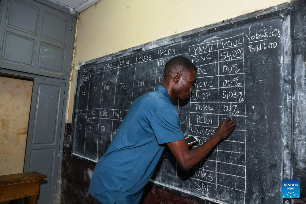 An election official records ballot counts on a blackboard at a polling station in Yaounde, capital of Cameroon, on Oct. 12, 2025. Voting for Cameroon's presidential election ended on Sunday evening, with ballot counting now underway across the country. Polling opened at 8:00 a.m. and closed at 6:00 p.m. local time, with more than eight million registered voters casting their ballots to choose the country's next president. According to Cameroon's Electoral Code, the Constitutional Council must announce the official results within 15 days. (Xinhua/Kepseu)