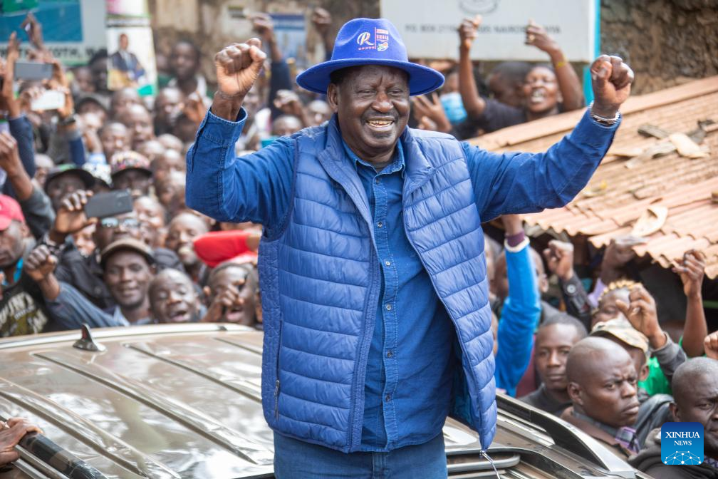 This file photo taken on Aug. 9, 2022 shows Kenyan former Prime Minister Raila Odinga addressing his supporters after casting his ballot during a presidential election in Nairobi, Kenya. Kenya's former Prime Minister Raila Odinga died Wednesday from a heart attack at a hospital in India, the presidency confirmed. (Photo by Fred Mutune/Xinhua)