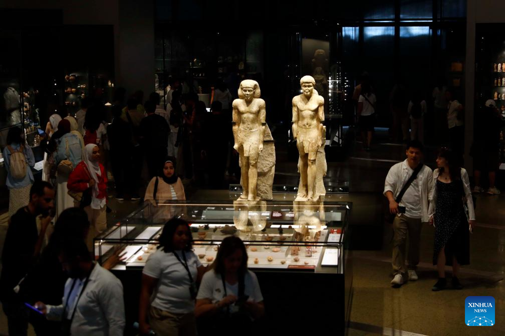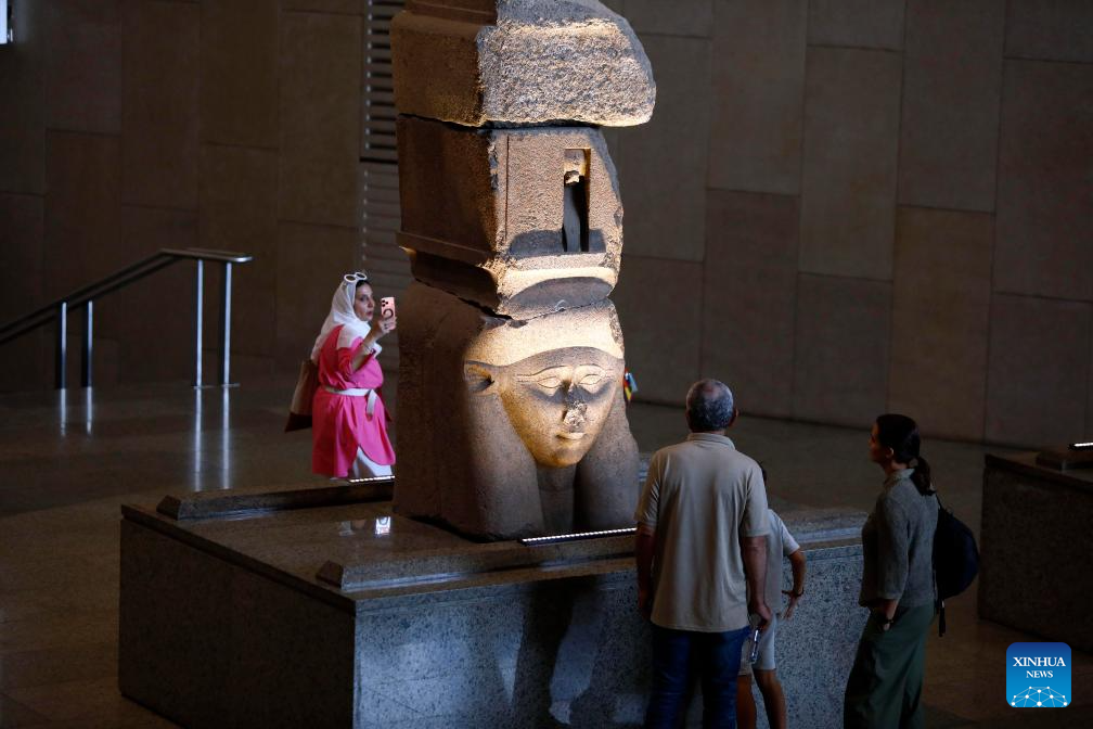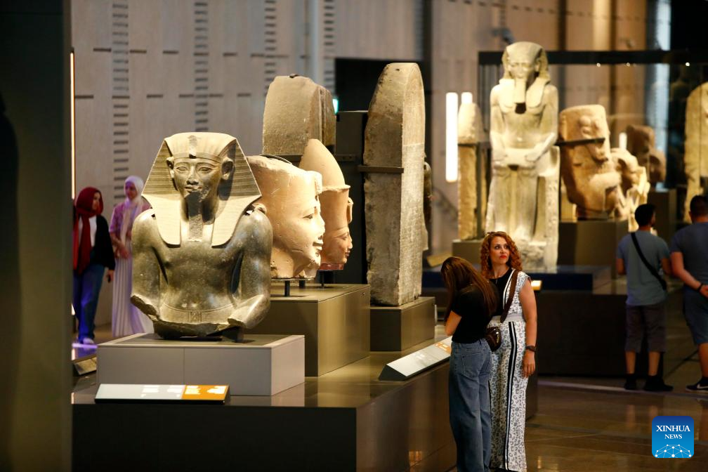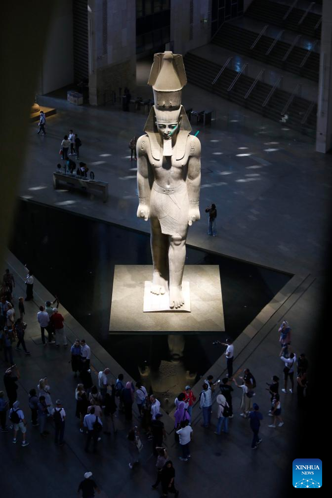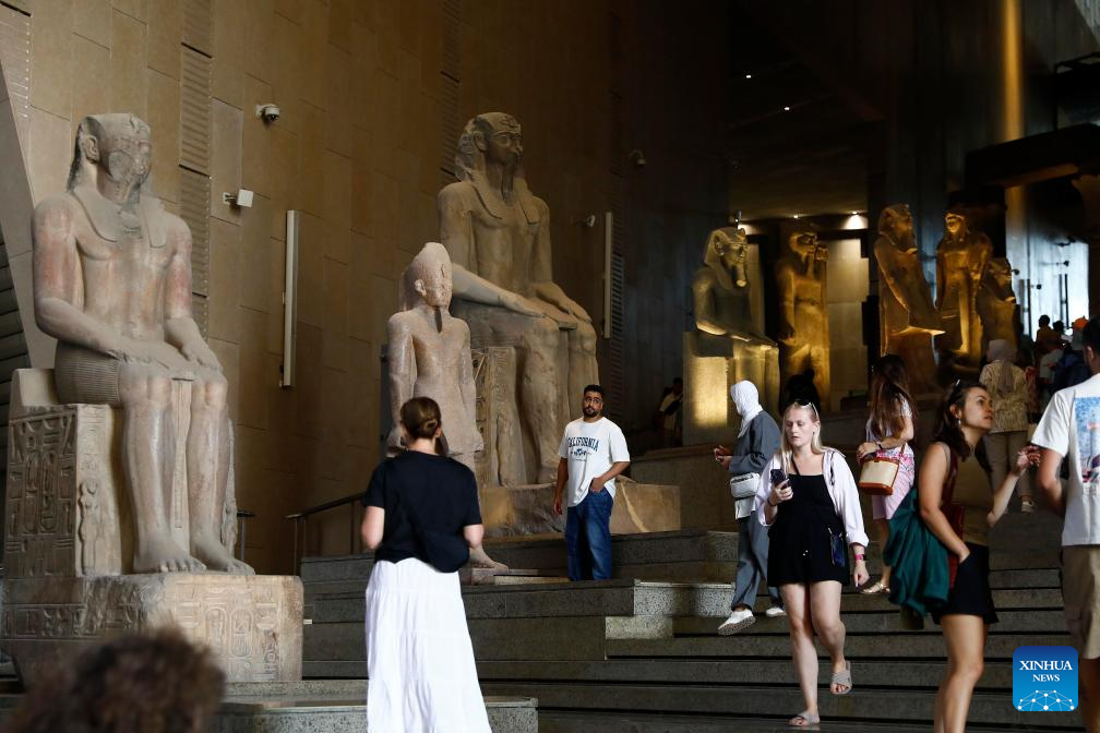 Tourists view exhibits at the Grand Egyptian Museum in Giza, Egypt, Oct. 14, 2025. Egypt's Grand Egyptian Museum (GEM) is temporarily closed to the public from Oct. 15 to Nov. 3 in preparation for its official opening, scheduled for early November, according to an announcement published Monday on the museum's official website. (Xinhua/Ahmed Gomaa)
