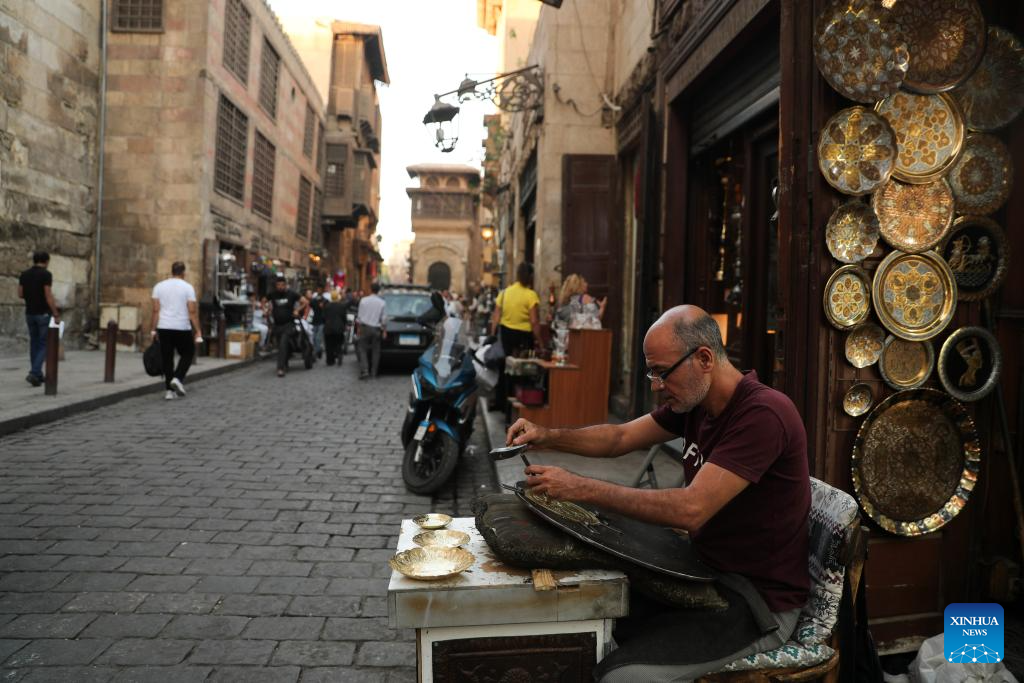 A craftsman makes copper handiwork on an old street near the Khan el-Khalili old market in Cairo, Egypt, on Oct. 22, 2025. Located in the heart of Cairo's old Islamic district, the centuries-old marketplace of Khan el-Khalili is considered one of the most popular tourist attractions in Egypt. (Xinhua/Sui Xiankai)