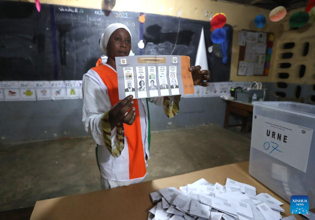 A staff member shows a ballot at a polling station in Abidjan, Cote d'Ivoire, Oct. 25, 2025. Polling stations for Cote d'Ivoire's presidential election closed at 6 p.m. local time on Saturday, marking the beginning of vote counting in Abidjan, local media reported. (Photo by Yvan Sonh/Xinhua)