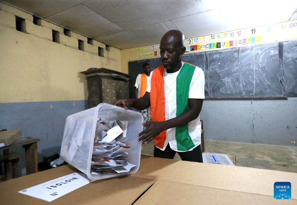 A staff member prepares to count ballots at a polling station in Abidjan, Cote d'Ivoire, Oct. 25, 2025. Polling stations for Cote d'Ivoire's presidential election closed at 6 p.m. local time on Saturday, marking the beginning of vote counting in Abidjan, local media reported. (Photo by Yvan Sonh/Xinhua)
