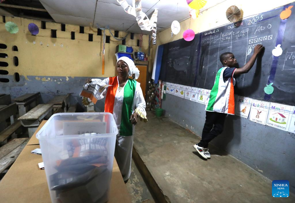 A staff member writes the names of candidates on a blackboard at a polling station in Abidjan, Cote d'Ivoire, Oct. 25, 2025. Polling stations for Cote d'Ivoire's presidential election closed at 6 p.m. local time on Saturday, marking the beginning of vote counting in Abidjan, local media reported. (Photo by Yvan Sonh/Xinhua)