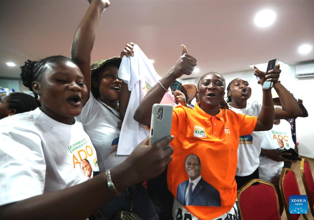 Supporters of Alassane Ouattara celebrate at the headquarter of the Rally of Houphouetists for Democracy and Peace, in Abidjan, Cote d'Ivoire, Oct. 27, 2025. Cote d'Ivoire's incumbent President Alassane Ouattara, candidate of the Rally of Houphouetists for Democracy and Peace, has won a fourth term in the presidential election with 89.77 percent of the votes, according to provisional results released Monday by the country's Independent Electoral Commission (CEI). (Photo by Yvan Sonh/Xinhua)