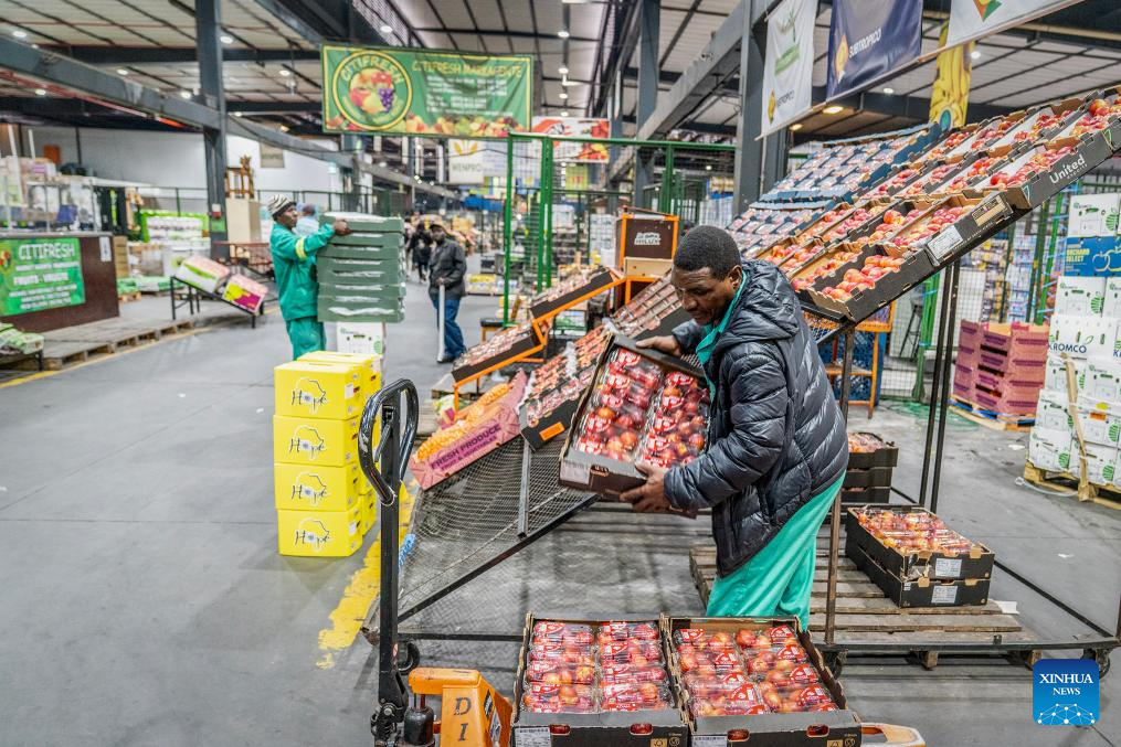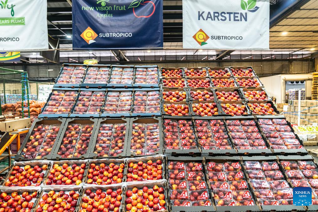 A worker packs nectarines at the Johannesburg Fresh Produce Market in South Africa, on Oct. 29, 2025. In recent days, South African fruit traders have been actively stocking up on fruit for export to China. According to a recent trade agreement reached between the South African and Chinese governments, South Africa is authorized to export five types of fruits, including apricots, peaches, nectarines, plums, and prunes, to China. (Photo by Shiraaz Mohamed/Xinhua)