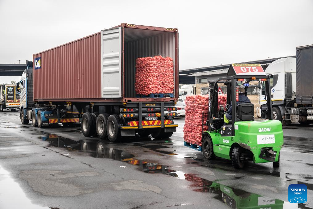 Workers drive forklifts to load boxes of fruits onto trucks at the Johannesburg Fresh Produce Market in South Africa, on Oct. 29, 2025. In recent days, South African fruit traders have been actively stocking up on fruit for export to China. According to a recent trade agreement reached between the South African and Chinese governments, South Africa is authorized to export five types of fruits, including apricots, peaches, nectarines, plums, and prunes, to China. (Photo by Shiraaz Mohamed/Xinhua)