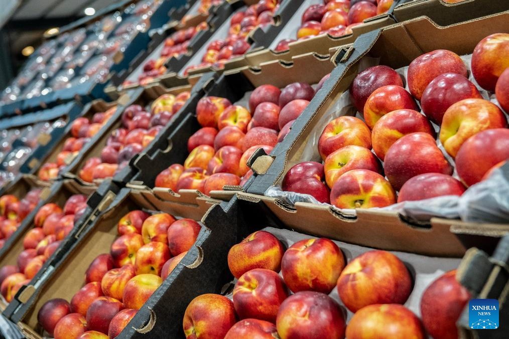 Trays of nectarines are seen on a shelf at the Johannesburg Fresh Produce Market in South Africa, on Oct. 29, 2025. In recent days, South African fruit traders have been actively stocking up on fruit for export to China. According to a recent trade agreement reached between the South African and Chinese governments, South Africa is authorized to export five types of fruits, including apricots, peaches, nectarines, plums, and prunes, to China. (Photo by Shiraaz Mohamed/Xinhua)