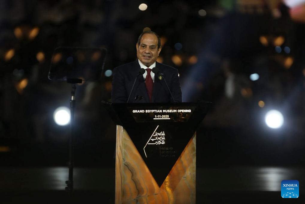 Egyptian President Abdel-Fattah al-Sisi addresses the inauguration of the Grand Egyptian Museum (GEM) in Giza, Egypt, Nov. 1, 2025. After two decades of construction, Egypt on Saturday inaugurated the GEM -- the world's largest museum dedicated to a single civilization -- during a grand ceremony held near the pyramids and the Sphinx, marking a landmark cultural event for the country renowned for its rich heritage. (Xinhua)