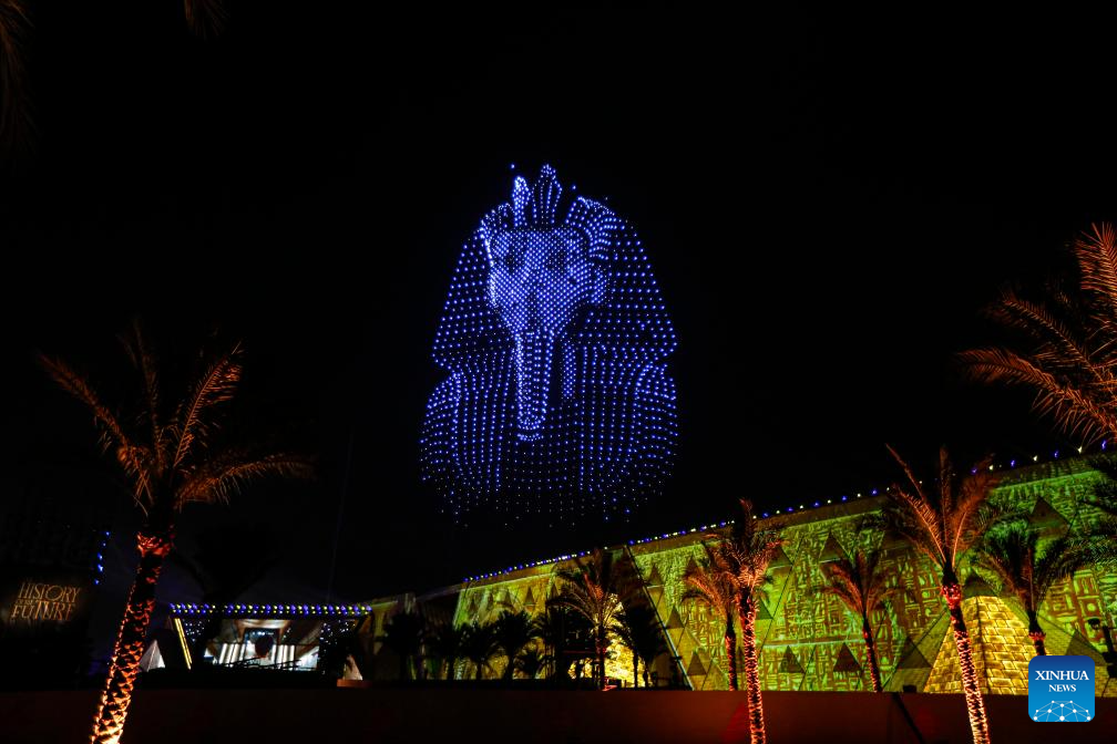This photo taken on Nov. 1, 2025 shows a drone and light show during the inauguration of the Grand Egyptian Museum (GEM) in Giza, Egypt. After two decades of construction, Egypt on Saturday inaugurated the GEM -- the world's largest museum dedicated to a single civilization -- during a grand ceremony held near the pyramids and the Sphinx, marking a landmark cultural event for the country renowned for its rich heritage. (Xinhua/Ahmed Gomaa)