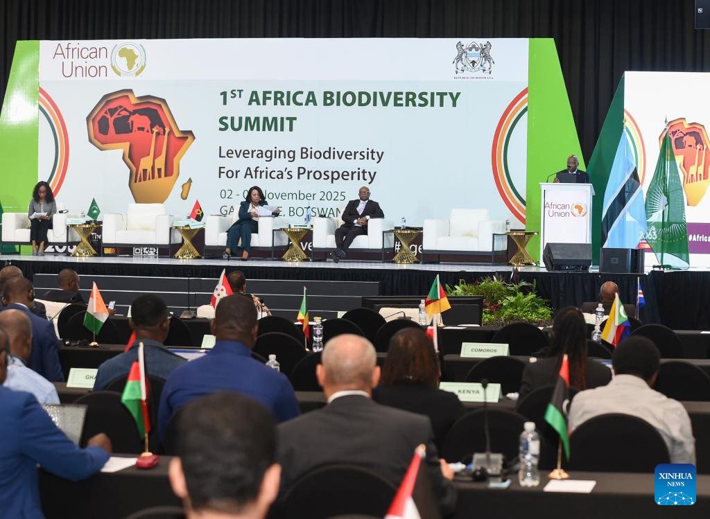 African Union Commissioner for Agriculture, Rural Development, Blue Economy and Sustainable Environment Moses Vilakati (at the podium) speaks at the first Africa Biodiversity Summit's Ministerial Segment in Gaborone, Botswana, Nov. 4, 2025. The African Union (AU) on Tuesday urged its members to take "decisive action" to conserve nature for the continent's survival and prosperity. (Photo by Tshekiso Tebalo/Xinhua)