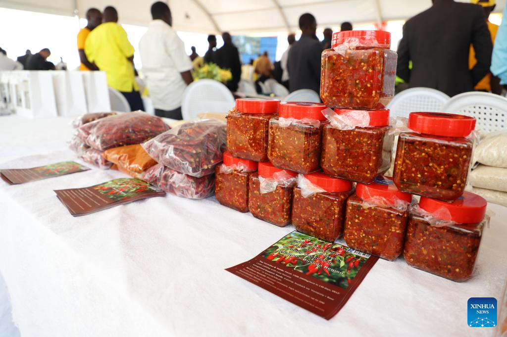 This photo taken on Nov. 20, 2025 shows chili products displayed at the flag-off event of Uganda's first shipment of dried chili to China, in Kamuli, Uganda, Nov. 20, 2025. Ugandan President Yoweri Museveni has flagged off the country's first shipment of dried chili to China, one year after the two countries signed a bilateral agreement allowing the agricultural product to access the Chinese market.(Photo by Ronald Ssekandi/Xinhua)