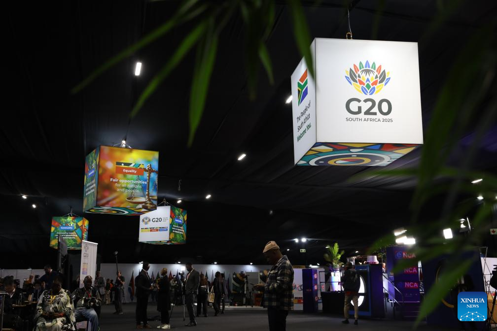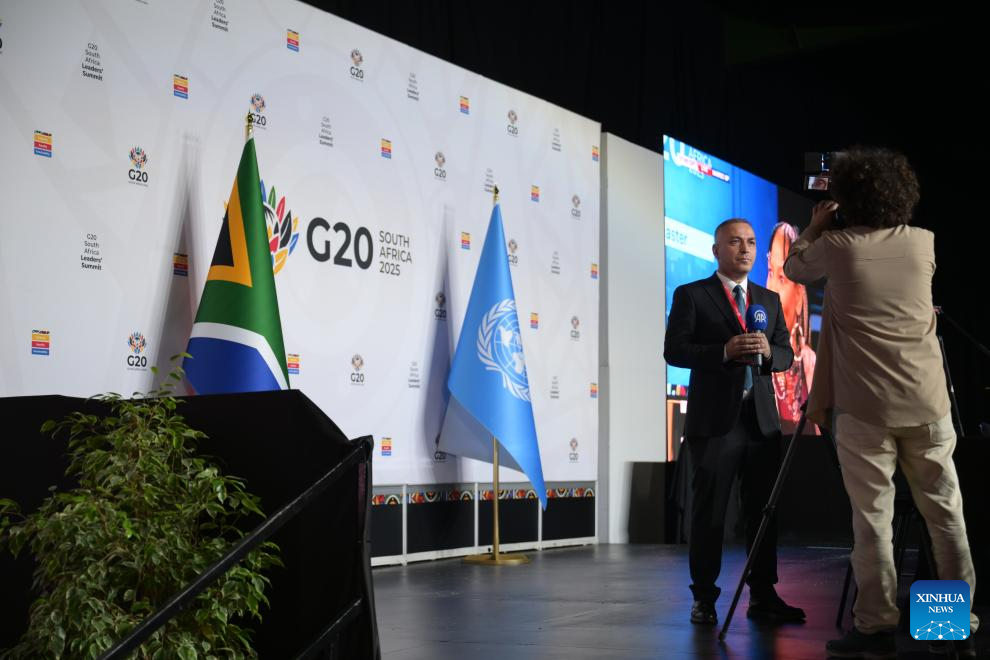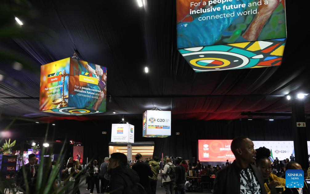 Media workers are pictured at the venue for the 20th Group of Twenty (G20) Summit in Johannesburg, South Africa, on Nov. 22, 2025. The Group of Twenty (G20) Summit opened here Saturday, marking the first time the event is being held in Africa. (Xinhua/Yang Guang)