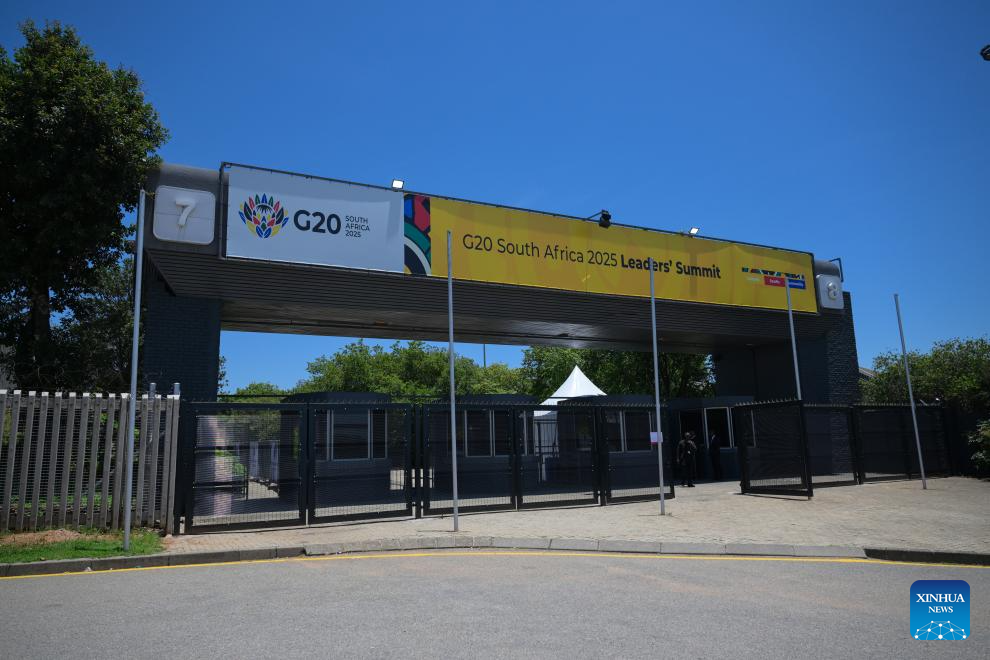 This photo taken on Nov. 22, 2025 shows the entrance of the venue for the 20th Group of Twenty (G20) Summit in Johannesburg, South Africa. The Group of Twenty (G20) Summit opened here Saturday, marking the first time the event is being held in Africa. (Xinhua/Yang Guang)