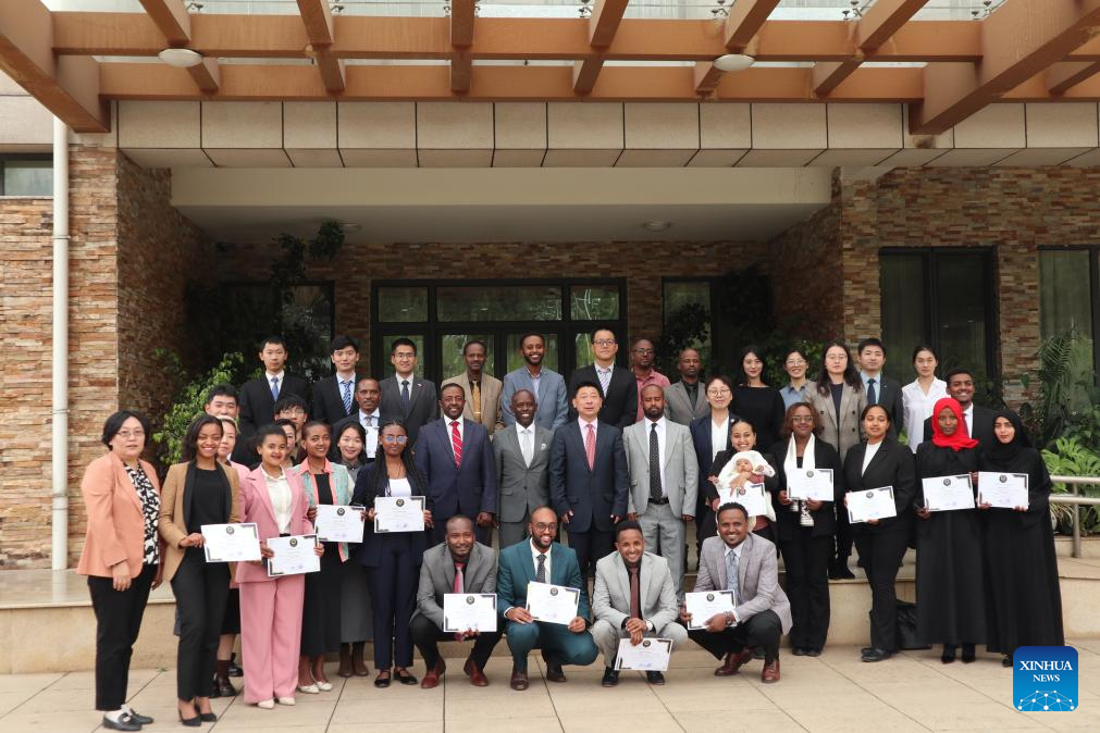 Guests pose for a group photo with young Ethiopian diplomats who have finished an online Chinese language training program in Addis Ababa, Ethiopia's capital, on Nov. 27, 2025. A ceremony has been held in Addis Ababa, Ethiopia's capital, to mark the completion of an online Chinese language training program for young Ethiopian diplomats. (Xinhua/Liu Fangqiang)