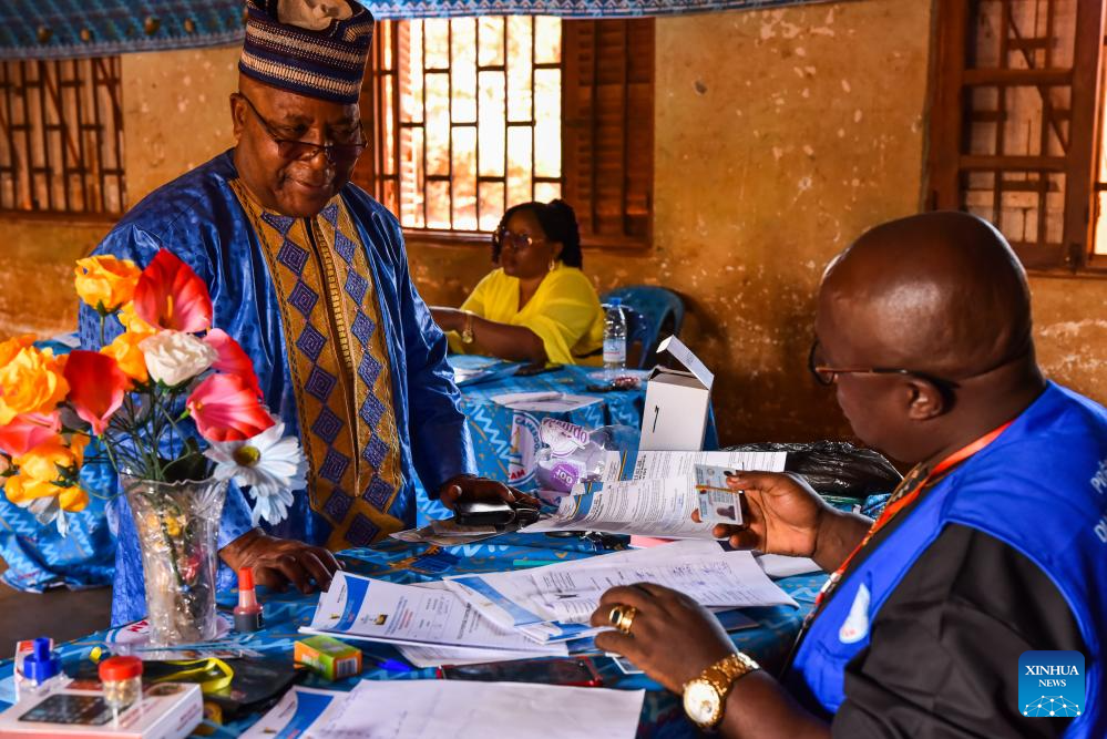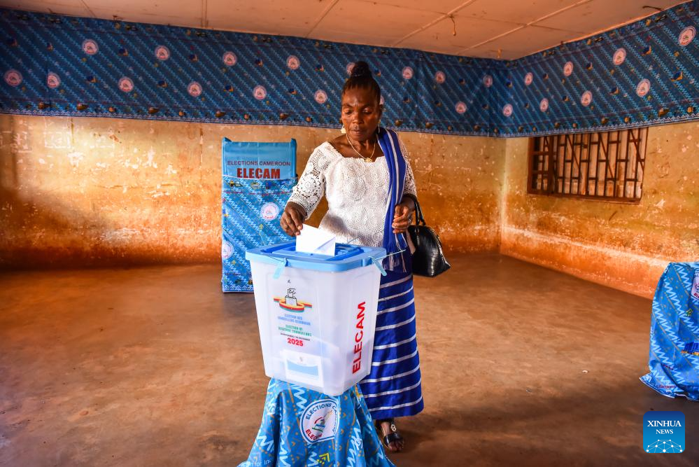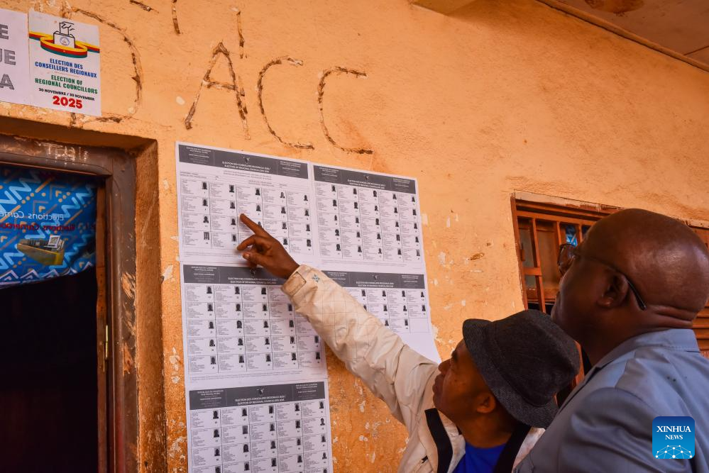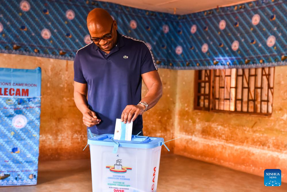 A voter casts a ballot during Cameroon's regional elections at a polling station in Bangante, Cameroon, Nov. 30, 2025. Voting for Cameroon's regional elections began early Sunday, with polling starting nationwide at 8 a.m. (0700 GMT) local time. Municipal councilors and traditional rulers will elect 900 regional councilors to serve five-year terms, with 90 in each of the country's 10 regions. (Xinhua/Kepseu)