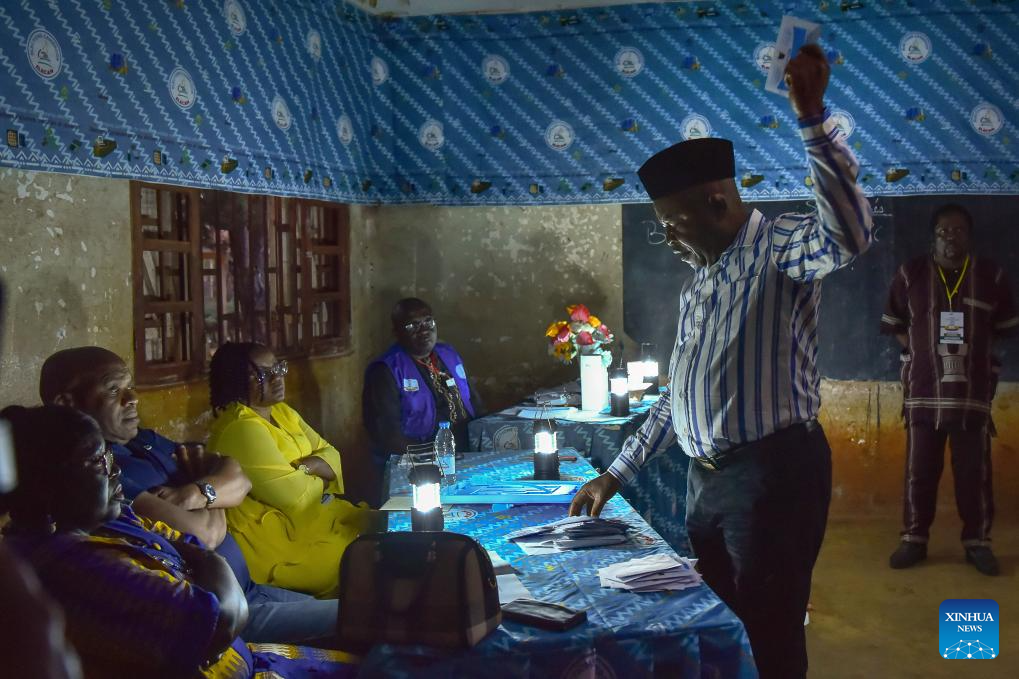 Election officials count ballots during Cameroon's regional elections at a polling station in Bangante, Cameroon, Nov. 30, 2025. Voting for Cameroon's regional elections began early Sunday, with polling starting nationwide at 8 a.m. (0700 GMT) local time.